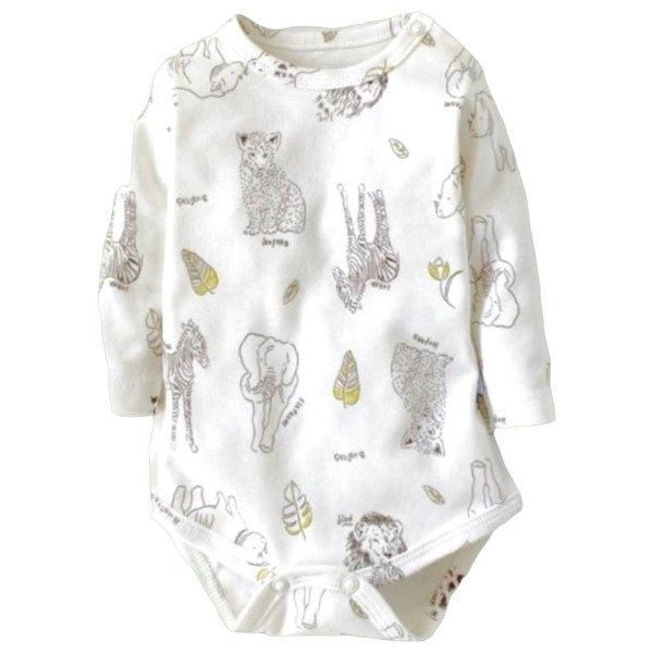 Body manga larga, de algodón. Estampado de animales de la selva en tonos beige, marrón claro y verde musgo.