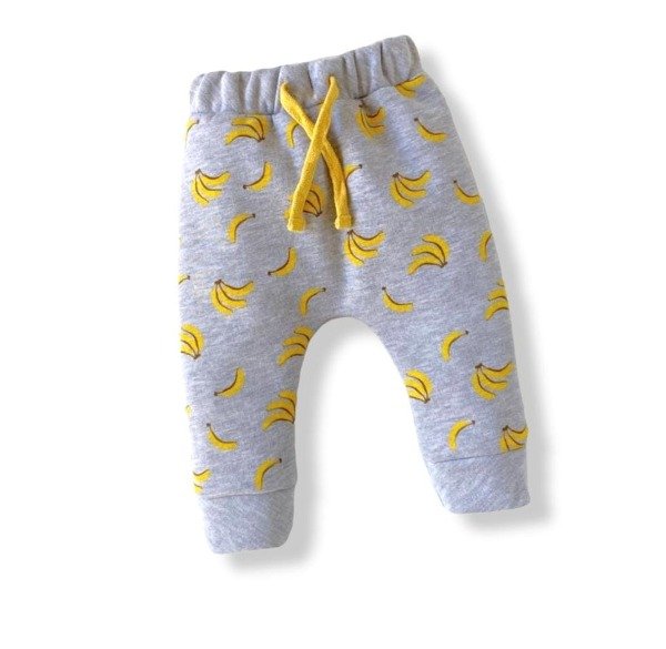 Babucha frizada color gris melange, con estampa de bananas. Cintura con elástico y cordón haciendo juego para ajustarla