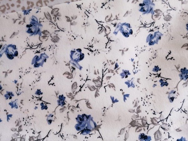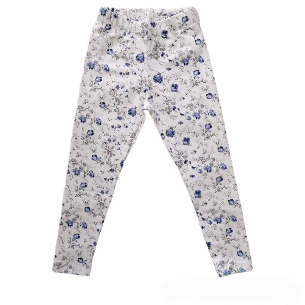 Calza confeccionada en algodón elastizado de color blanco con estampa de flores en azul.
