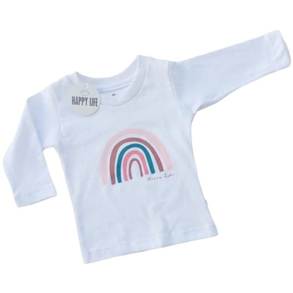 Remera de algodón manga larga, con dibujo de arcoiris.